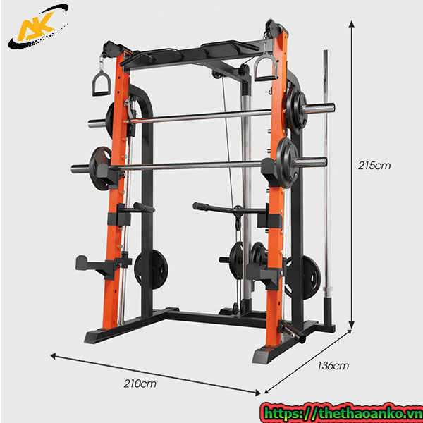 Khung năng K9 có chức năng Squat với đòn tạ tích hợp đi kèm. Hai bên khung có móc chốt, đảm bảo an toàn cho người dùng trong suốt quá trình tập luyện. Máy tập có kèm theo ghế vớt tạ, xà đơn - xà kép, thanh kéo xô,... để hỗ trợ tập luyện. Yên ghế ngồi của ghế vớt tạ có thể điều chỉnh độ dốc một cách linh hoạt.
